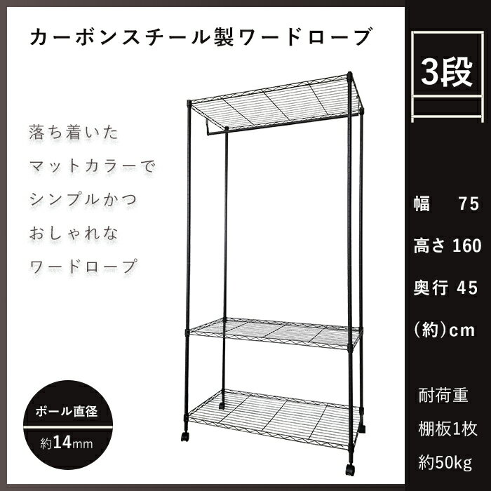ポール直径14mm カーボンスチール製 ワードローブ 3段 メタルラック ラック ハンガー クローゼット 棚付 洋服収納 幅75×高さ160×奥行45(約)cm ◇CJ-C1124